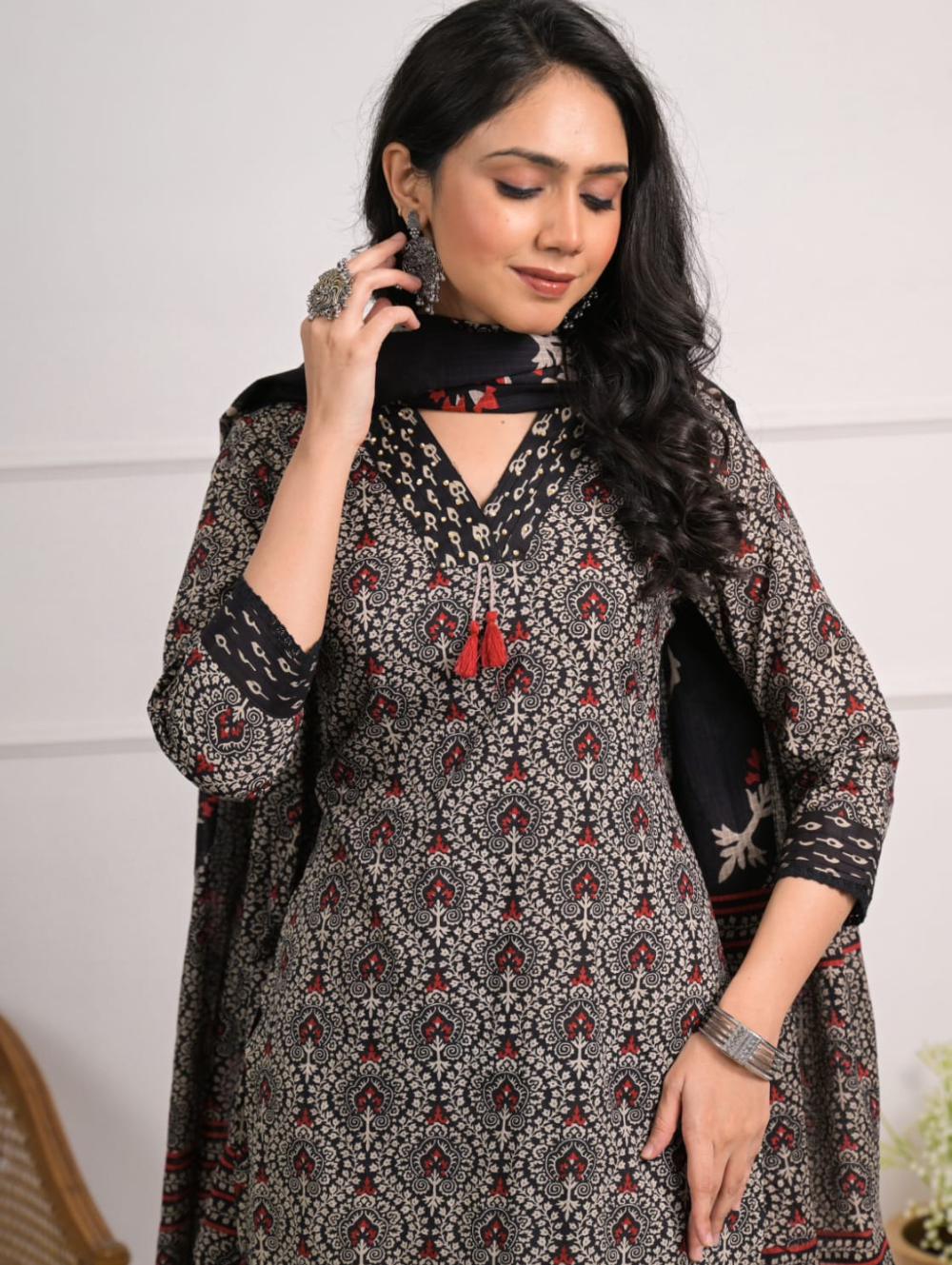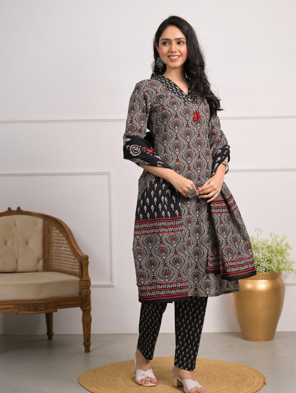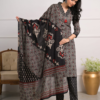 Enjoy the comfort of pure premium cotton with this printed kurti set, featuring a stylish neck print and a delicate pearl handwork touch. Paired with matching cotton printed pants and a coordinating dupatta, this set is perfect for casual elegance and all-day wear.